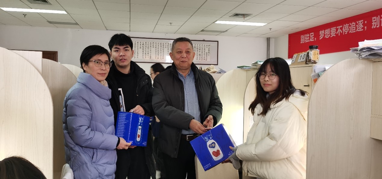 老师们和部分备考学生进行了简短的交流,鼓励考研学子要有朝着目标努力奋斗的信心,要有沉着迎接各种考验和挑战的决心,要有合理作息、战胜自我的恒心,并相信同学们一定会收获属于自己的成功,同时建议同学们注意补充营养,保证体力。随后,胡院长和郑书记给每一位备考学生送上了一箱酸奶。收到澳门六合彩开奖现场直播