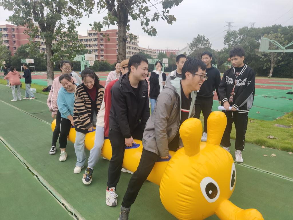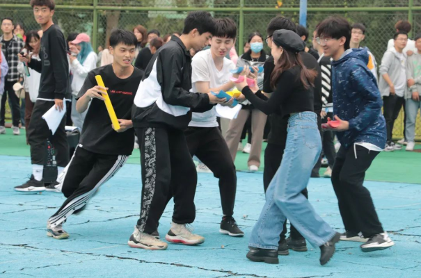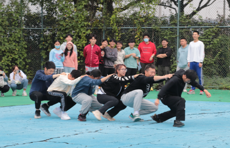 随着裁判的“请各位参赛选手准备”,趣味运动会正式开始。本次趣味运动会设置了披荆斩棘、螃蟹赛跑、珠行万里、毛毛虫竞速、拔河等若干个项目。在披荆斩棘集合项目中,参赛选手们喊着“一二一”的口号大步向前,虽有磕绊,但始终以一个整体大步迈向终点,随后六名队员以纵队形式蹲下,后一人将手搭在前一人的肩上以鸭子步前行,选手们强忍笑意,但谁也不落后,摇摇晃晃向前走去。螃蟹赛跑项目中,掌握了技巧的选手们如飞人一般在场地上穿梭,围观同学拍手叫好。在毛毛虫竞速项目中,队员全力以赴,展现速度与技巧的完美融合。拔河项目中,选手们心往一处想,力往一处使,花式装备更是充分体现了大家必胜的决心以及团结的强大力量。
