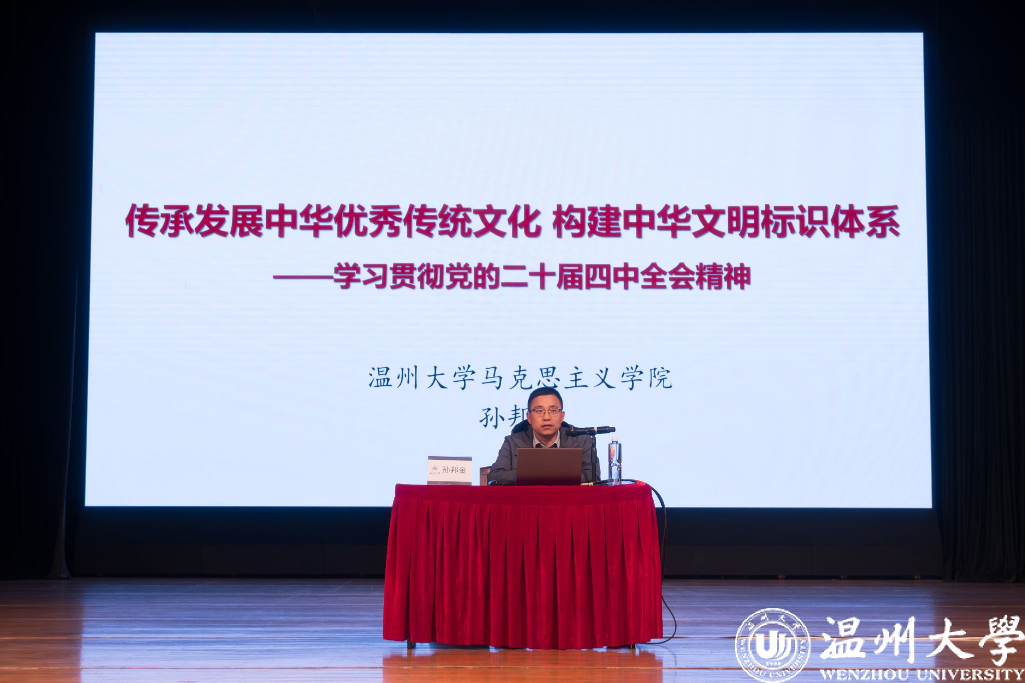 那么如何构建中华文明标识体系呢?孙老师强调文化认同是民族认同的核心,中华优秀传统文化是中华民族的根与魂。他阐释了中华文明标识体系的核心内涵,包括有形的文化地标(如长城、江心屿、五马街等)、无形的精神标识(如天下为公、民为邦本、和而不同等核心理念)以及非物质文化遗产(如中医、传统手工艺等),并结合何尊“宅兹中国”铭文、贾湖骨笛、龙形图腾等考古发现与文化遗产,生动展现了中华文明连续不断、多元一体、兼收并蓄的突出特性。孙老师表示,构建中华文明标识体系是文化强国建设的重要内容,既要挖掘传承传统文化精华,也要注重开放包容与现代融合,让中华文明为人类发展提供有益借鉴。