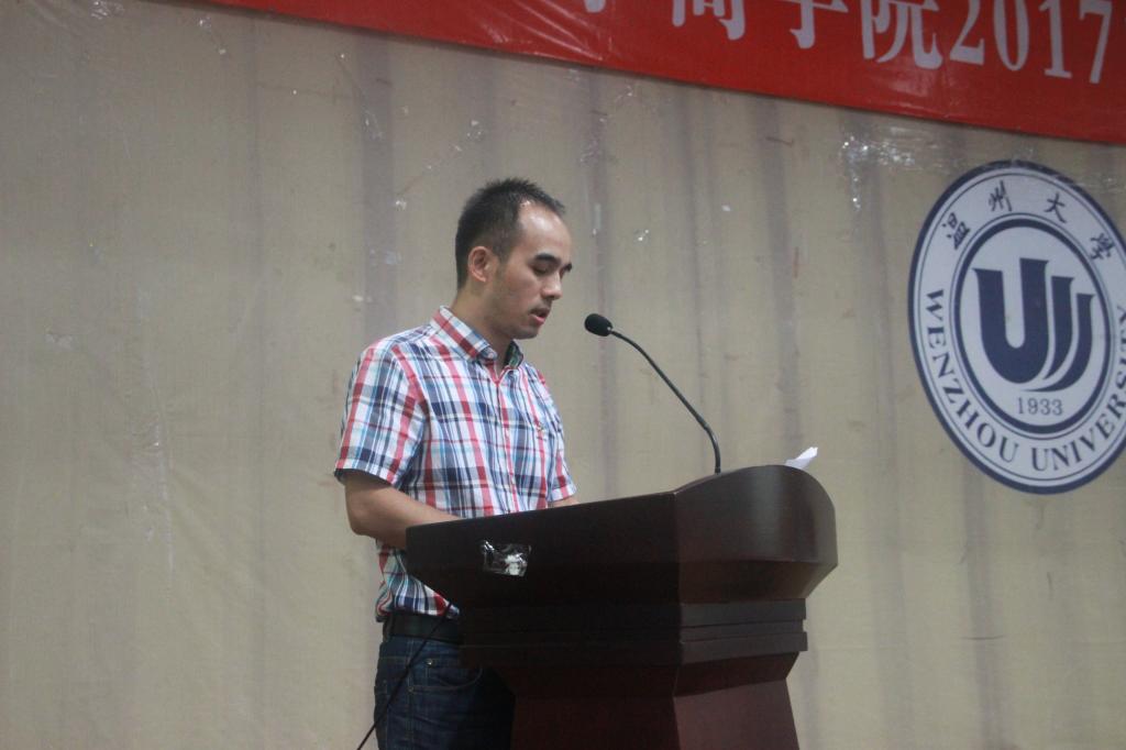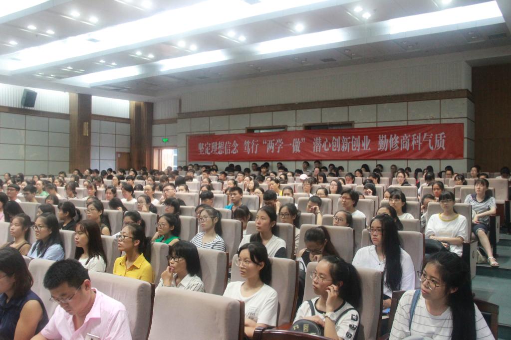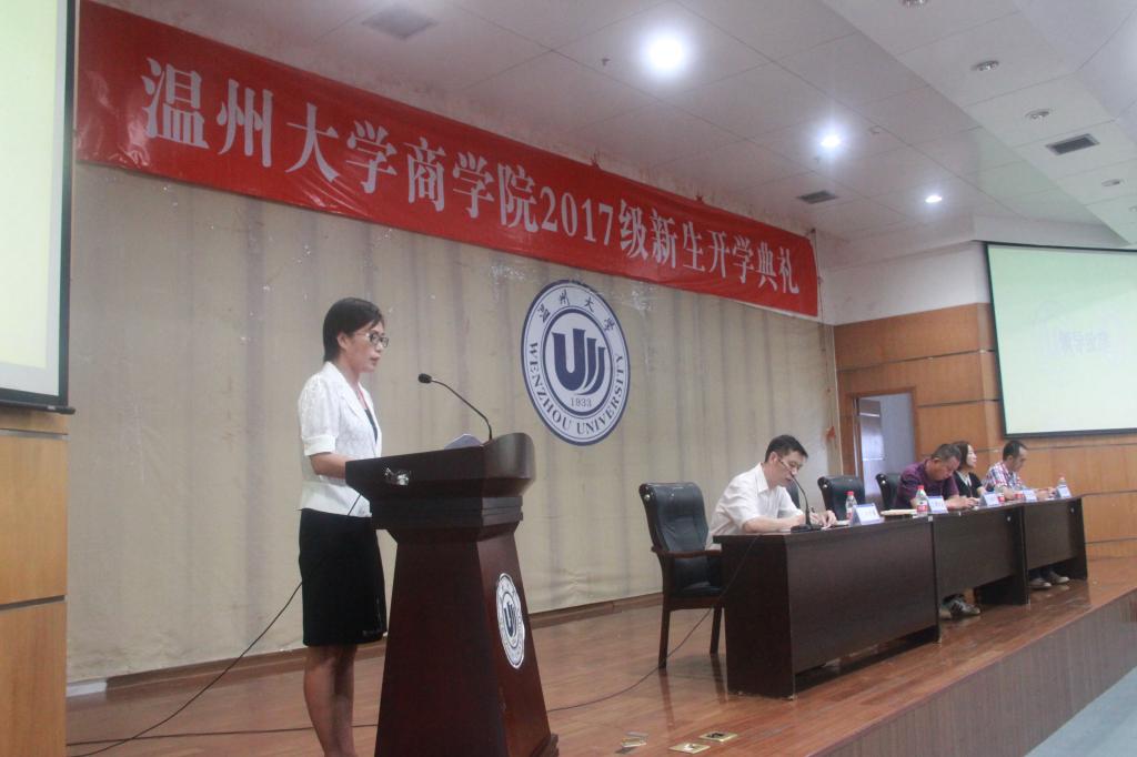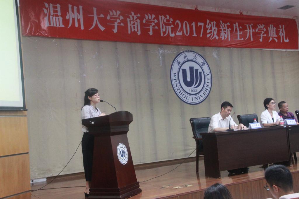 向17级新生的到来表示衷心的祝贺和诚挚的欢迎。郑书记围绕“概率与你”的主题,向新生提出“提高大学期间成才的概率、提高大学期间善于交往的概率、提高大学期间强身健体的概率、提高大学期间自我保护的概率”四方面的期望。她以17届优秀毕业生13金融工程班的朱圆缘同学为例,鼓励新生多与牛人交往,她认为交往是一种能力,善于交往更是一种智慧,要在交往中提升自己的格局;郑书记还以我院优秀校友王仲辉先生为例,建议新生及时明确目标,并付诸行动坚定前行。