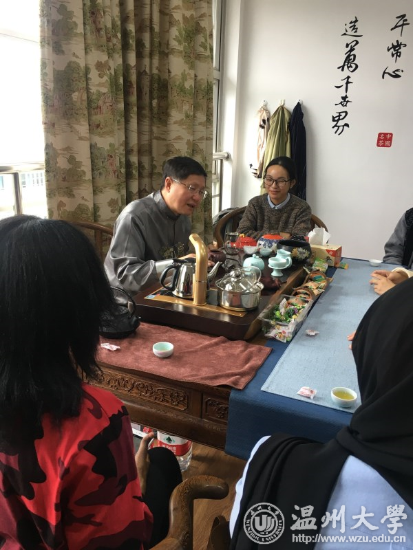 刚一进门,热情的徐世刚老师就招呼同学们坐下喝茶。在这次的品茗中,徐老师先是讲解了一些有关茶叶的基本知识,比如茶叶的分类等。徐老师不仅为大家泡茶,还告诉大家应该怎么喝茶。期间,留学生菲亚向老师提问:“喝茶有什么好处呢?”徐老师答道:“喝茶不仅能促进消化,加快代谢,还能美容养颜。喝茶Very Good! ”