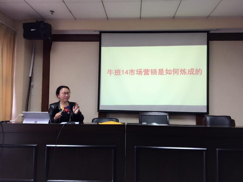 14市场营销班是有着良好学风和浓郁创业氛围的优秀班级,被营销系老师公认为“牛班”,班主任孙雷红老师获得温州大学优秀班主任称号。孙老师认为,“牛班”的核心是“牛人”,要使自己成为“牛人”,要有远大的理想、明确的目标、有“牛”一样的干劲、像“牛”一样的脚踏实地。在开始小部分“牛人”的带领下,越来越多的人就成为“牛人”,最后形成了“牛人团队”、“牛人班级”。孙老师相信,17营销新生有更好的文化素质,有很多成功榜样的示范带动,有我系众多优秀教师的引领,你们一定会超越14牛班。