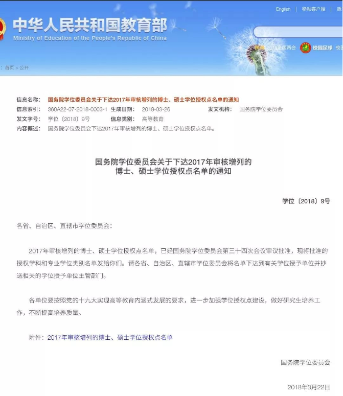 2018年3月22日,国务院学位委员会发布《关于下达2017年审核增列的博士、硕士学位授权点名单的通知》,我院申报的“应用经济学”一级学科学术硕士授予权和“金融”专业硕士授予权双双获得批准。