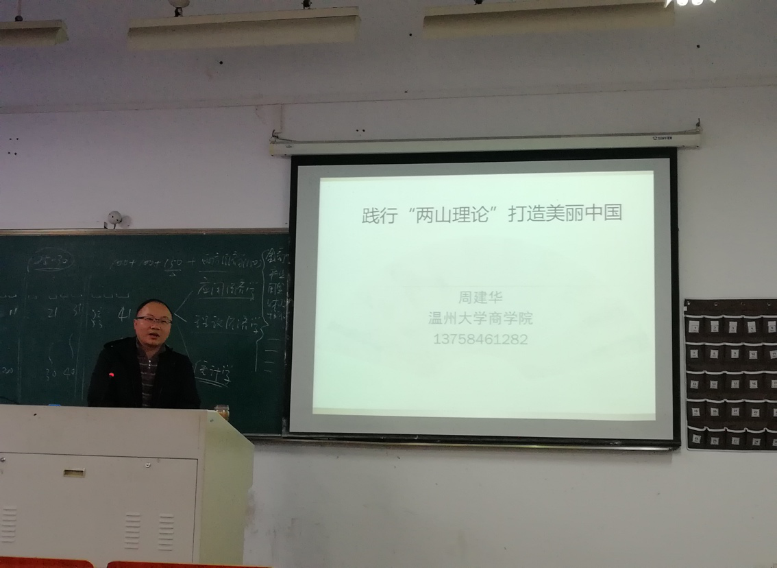 首先,周建华老师带领全班同学认真学习“两山”理论。分别从“两山”理论的提出、“两山”理论的重大意义、“两山”理论与美丽中国等五个方面介绍了“两山”理论的基本内容。“两山”理论从2005年习近平总书记在浙江安吉考察时首次提出,到2013年习近平总书记在哈萨克斯坦纳扎尔巴纳大学的全面的、经典的论述,走过了萌芽-发展-成熟的过程,是马克思主义生态观中国化的最新理论成果。“两山”理论在浙江省也得到了很好的实践,浙江省省委在十三届四次全会提出的“五水共治”,就是“两山”理论在浙江省的突出现,经过几年的努力,治理效果显著,实现质变提升。