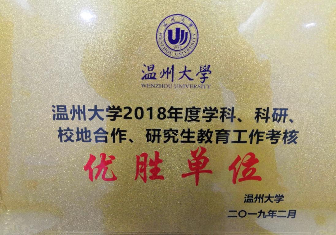 我院荣获“温州大学2018年度学科、科研、校地合作、研究生教育工作考核优胜单位”荣誉称号。