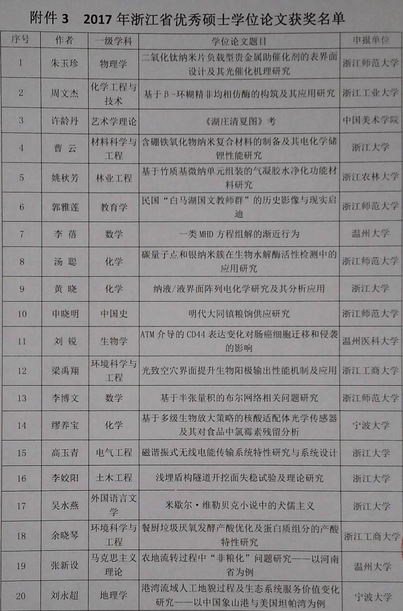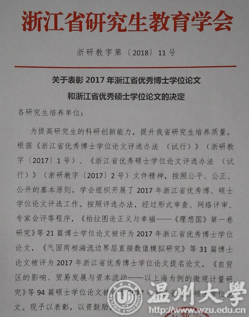 澳门六合彩开奖现场直播网站 14级研究生张新设(指导老师:胡振华教授)硕士论文被评为浙江省优秀硕士论文,该篇论文是全省唯一一个马克思主义理论类论文,该同学也是澳门六合彩开奖现场直播 首位浙江省优秀毕业论文的获奖者。