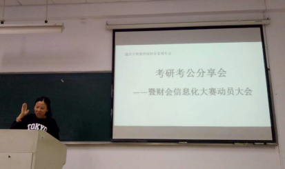由财会系党支部牵头、张敏老师和陈建萍老师组织、温大会计协会协助落实的“考研考公分享会暨2019年财会信息化竞赛启动大会”于2019年5月8号在北校区3-401如期举行。本次会议酝酿了一个多月,邀请了来自2015级财管的候晨瑶、陈晓莎等5位考研考公的学生代表。候晨瑶同学以笔试第一和复试第一的成绩考进了浙江财经大学会计学学硕,单佳男同学以复试第一综合第八的成绩考入了浙江财经大学会计学专硕,韩海燕以前10的成绩考进了浙江工商大学会计学学硕,陈晓莎和鉏楷文以第二名的成绩分别考入绍兴国税和嘉兴国税。他们分别从考研的院校选择、时间进度安排、书籍课件选择、专业课程的准备、考公的准备等方面给学弟学妹们做了有关非常详细的分享与经验交流。张敏老师从决心、信心和恒心来鼓励大家,从学习氛围、如何备考和坚持以及专业课程设计来引导大家交流。最后陈建萍老师就今年的财会信息化竞赛做了简要的动员。本次活动是一次答疑解惑的思想交流,是一次优良学风的传承,更是一次支部建设融入学科专业建设的体现。