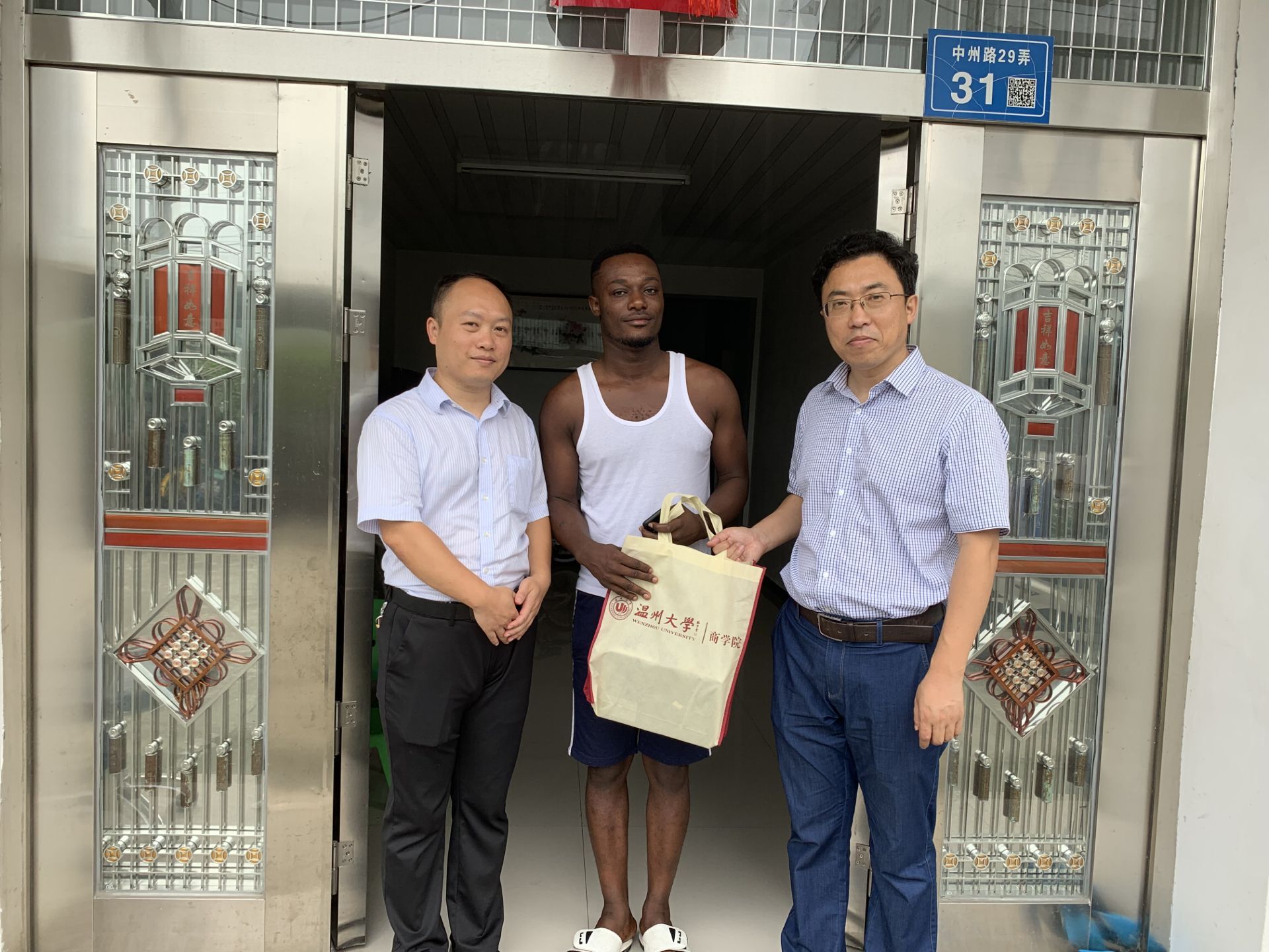 为其准备的温馨的小礼物,并向两位同学简单介绍了何为“百名教授访百家”。交谈中了解到,两位留学生同学在暑假里有不同的计划。暑期里,女朋友要回尼日利亚,在本国完成一些实习工作,之后会准备申请温大的研究生;而MICHAEL则要继续留在中国,他表示不单单要复习以往的课程知识,同时要准备温大研究生的申请工作。唐华书记和王洪斌主任从生涯规划角度和国际贸易专业发展前景的角度,给了他们很多实用的建议,并鼓励他们坚定目标,继续前行,合理规划学习和工作的时间分配,克服当下的一些困难,在中国创造属于自己的辉煌。此外,林大可老师叮嘱两位留学生暑假里要注意人生财产安全,遇到问题或困难要与学校老师多多沟通交流。