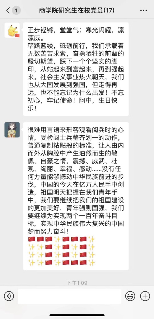 研究生党支部学生党员的自信,也坚信习近平总书记所说:中国的昨天已经写在人类的史册上,中国的今天正在亿万人民手中创造,中国的明天必将更加美好。全党全军全国各族人民要更加紧密地团结起来,不忘初心,牢记使命,继续把我们的人民共和国巩固好、发展好,继续为实现“两个一百年”奋斗目标、实现中华民族伟大复兴的中国梦而努力奋斗!最后,祝福祖国更加繁荣富强。
