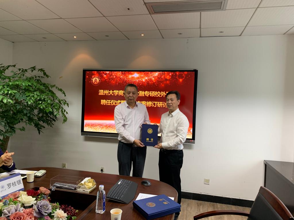 的聘任文件后,院长胡振华分别为温州市人民政府副秘书长章炜、龙湾农村合作银行总行行长刘少云、温州市招商银行副行长刘宗华、中国建设银行温州分行见习副行长夏诒恒、温州欣荣税务师事务所有限公司董事长罗桂银、浙江伟明环保股份有限公司董事长项光明、申万宏源证券温州分公司总经理瞿炳建、叁陆伍资本董事长王仲辉等8位校外硕士研究生导师颁发聘书。