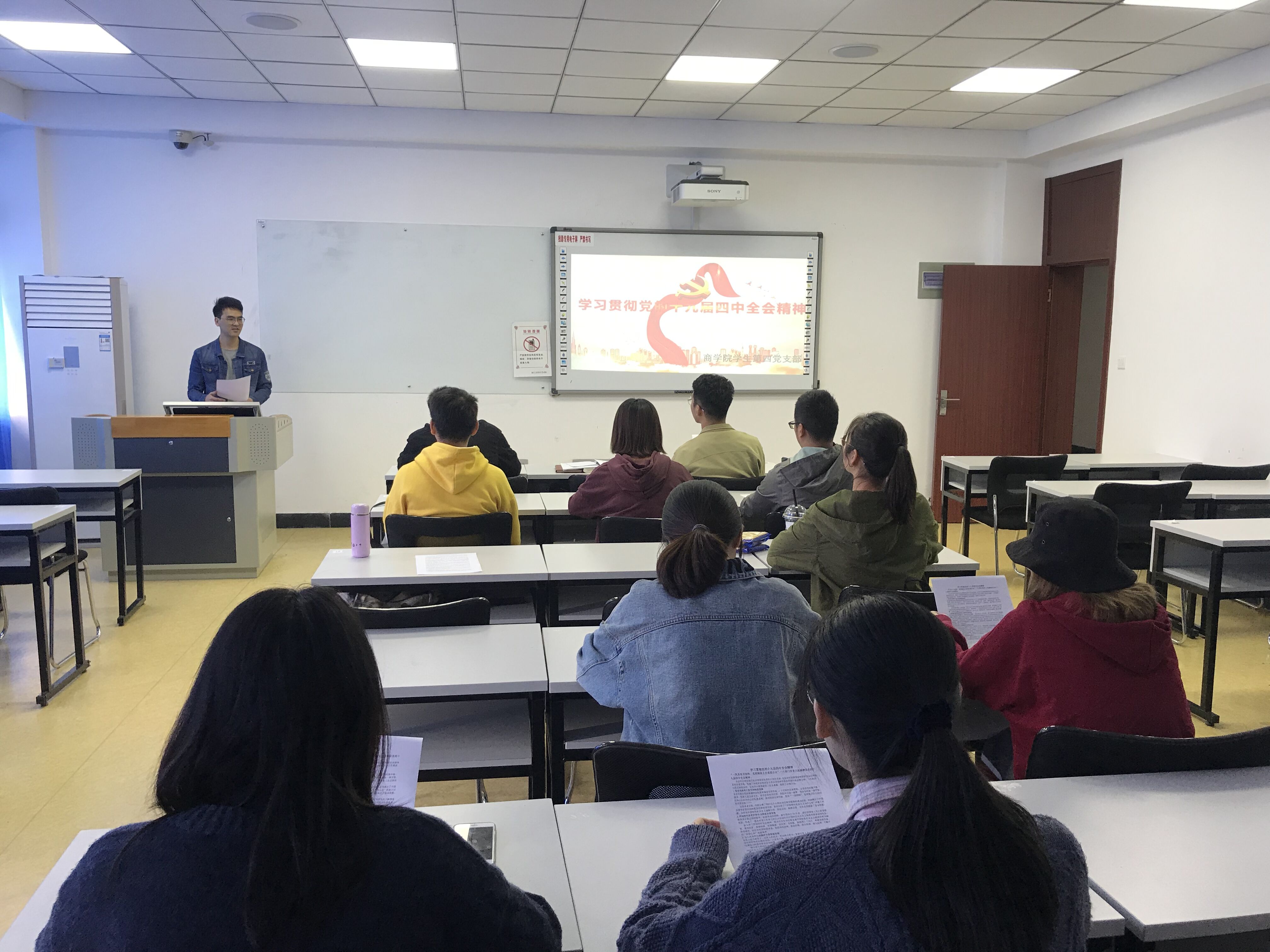 学生第四党支部学习贯彻党的十九届四中全会精神的专题活动。每位党员在未来前行的路上需要一座座灯塔有的是老革命前辈的指引,有的是身边思想觉悟高的党员共同前行。在本次的学习专题活动中,通过黄汉老师的讲解,深入地学习到了党的十九届四中全会的内容和精神,相信作为新时代中国大学生,一定能够通过学习十九届全会的会议精神能够锤炼敢于担当的政治品格,在党的光辉照耀下不断学习进步,做一名合格的党员,高标准要求自己做一名优秀的中国特色社会主义的建设者和接班人。