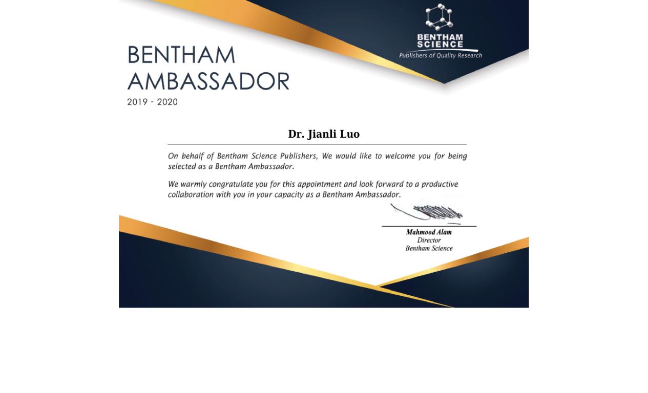 罗建利教授受邀担任Bentham Brand Ambassador(品牌形象大使)。