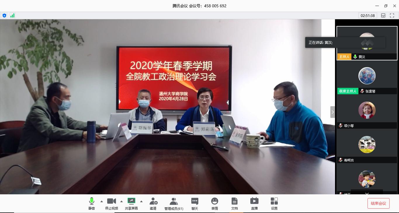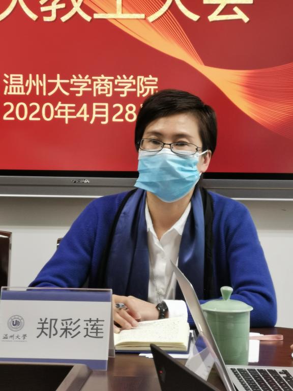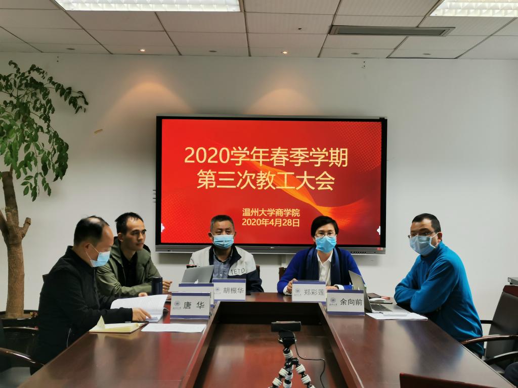 召开线上线下相结合的春季学期第三次教工大会,全体行政人员在A222会议室参加会议,专任老师在腾讯会议室参加会议,会议由郑彩莲书记主持。