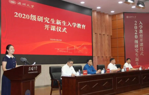 分会场在仲辉商道讲堂进行直播。开课仪式由刘玉侠院长主持。校长赵敏教授,党委庄兴忠副书记,副校长薛伟教授、研究生院刘玉侠院长、党委研究生工作部高红星部长在主会场出席始业教育。2020年是特殊又充满希望的一年,校长赵敏在表示对新生到来的祝贺和欢迎的同时,也向大家介绍了温州大学87年的办学历史,具体阐述了温州大学“俩校合并,七校融合”的历史变迁。介绍了黄溯初、金嵘轩、苏步青三位爱国、爱校者对温州大学办学史的付出和贡献。