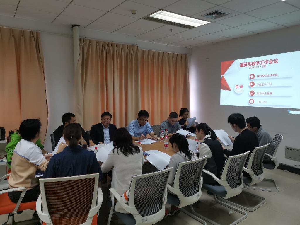 制定的温州大学教师教学业绩考核相关文件,全系教师就相关条款展开了讨论,进一步明确了业绩考核的相关要求;第二,启动了2021届毕业生毕业论文指导工作;第三,学习并讨论了学生学科竞赛相关的文件和赛事,为今后更好地指导学生学科竞赛和科研项目做好准备;第四,部署了下一个阶段的教学工作,包括国际贸易专业导论课的安排,一流专业、一流课程和各类教改项目的申报,以及后续集体教研活动的安排。